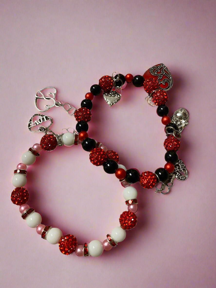 Beautiful red 10MM rhinestone bead accents with smaller smooth beads. The assorted V-Day charms highlight the aesthetic of this piece.