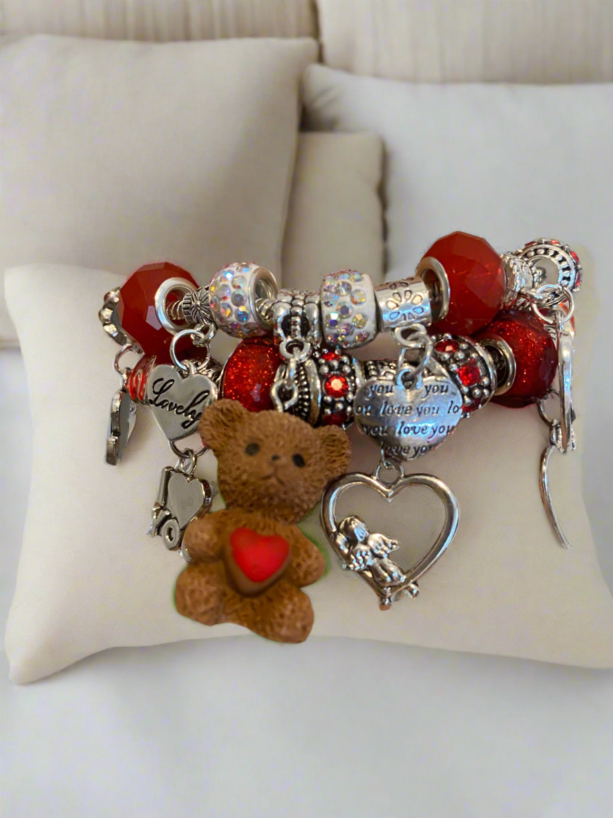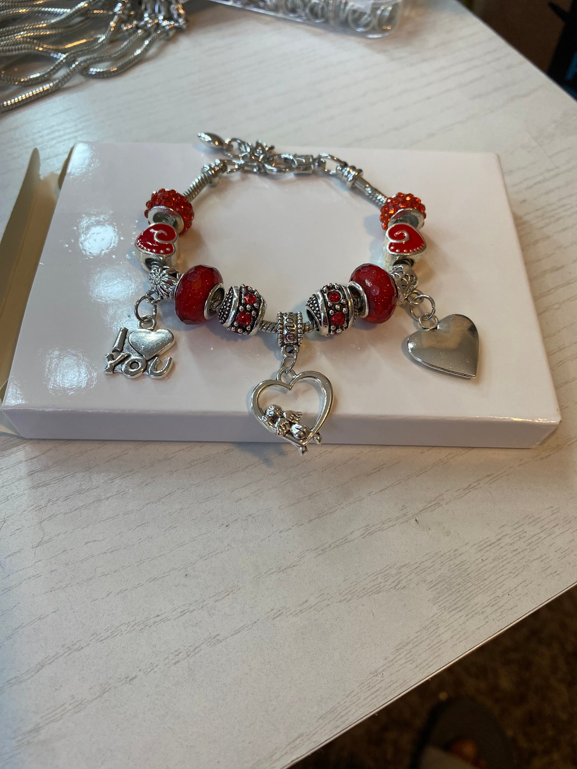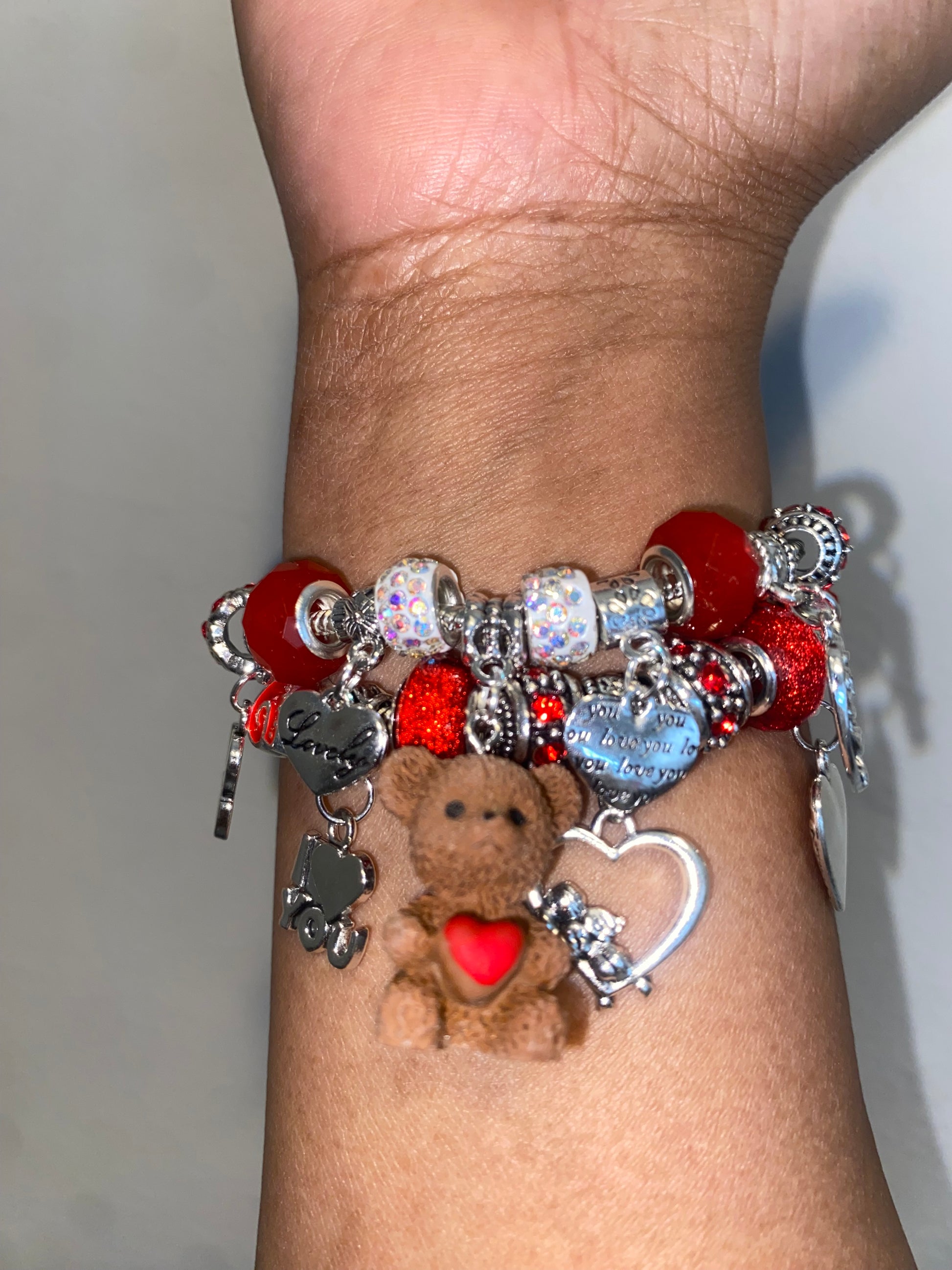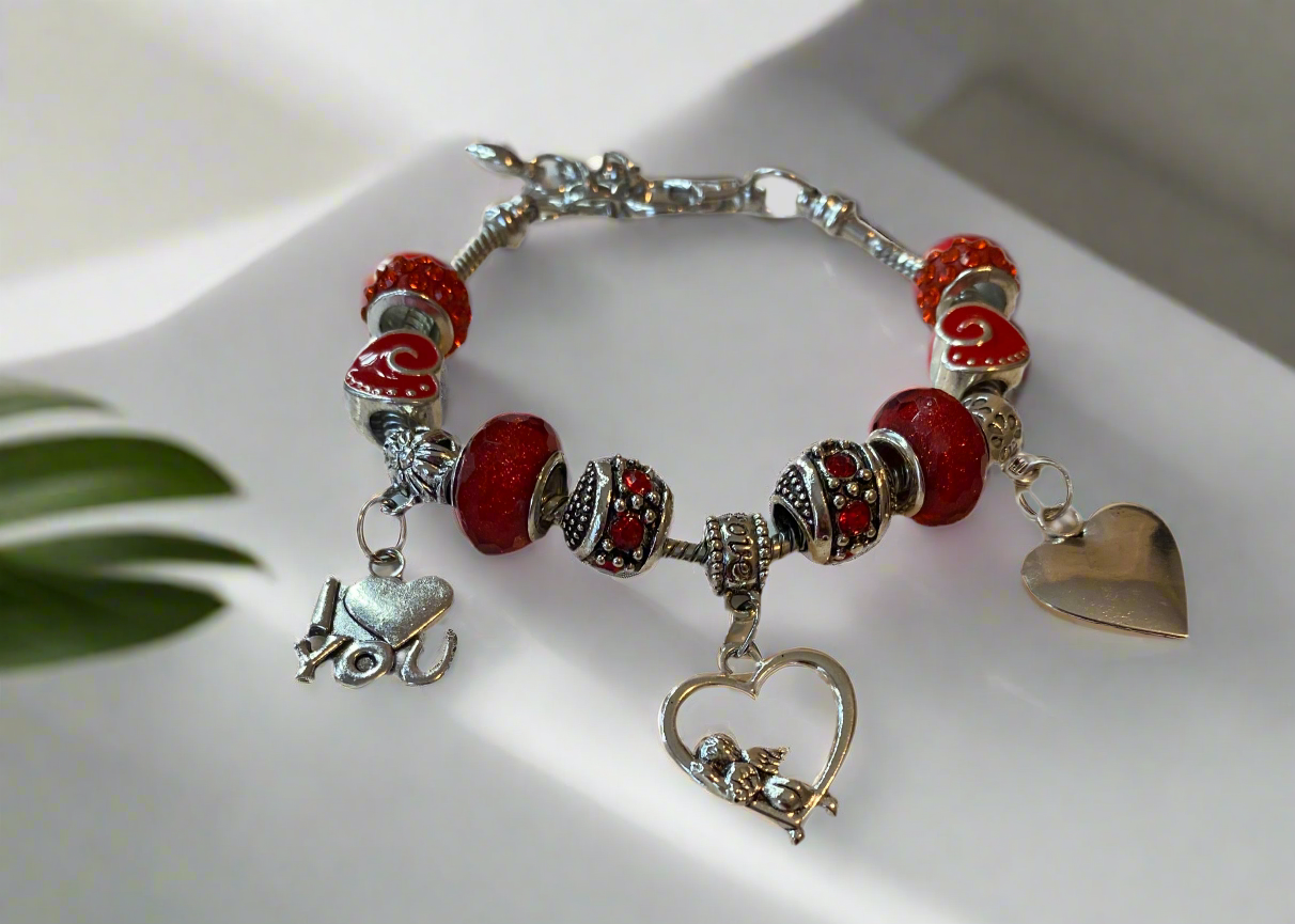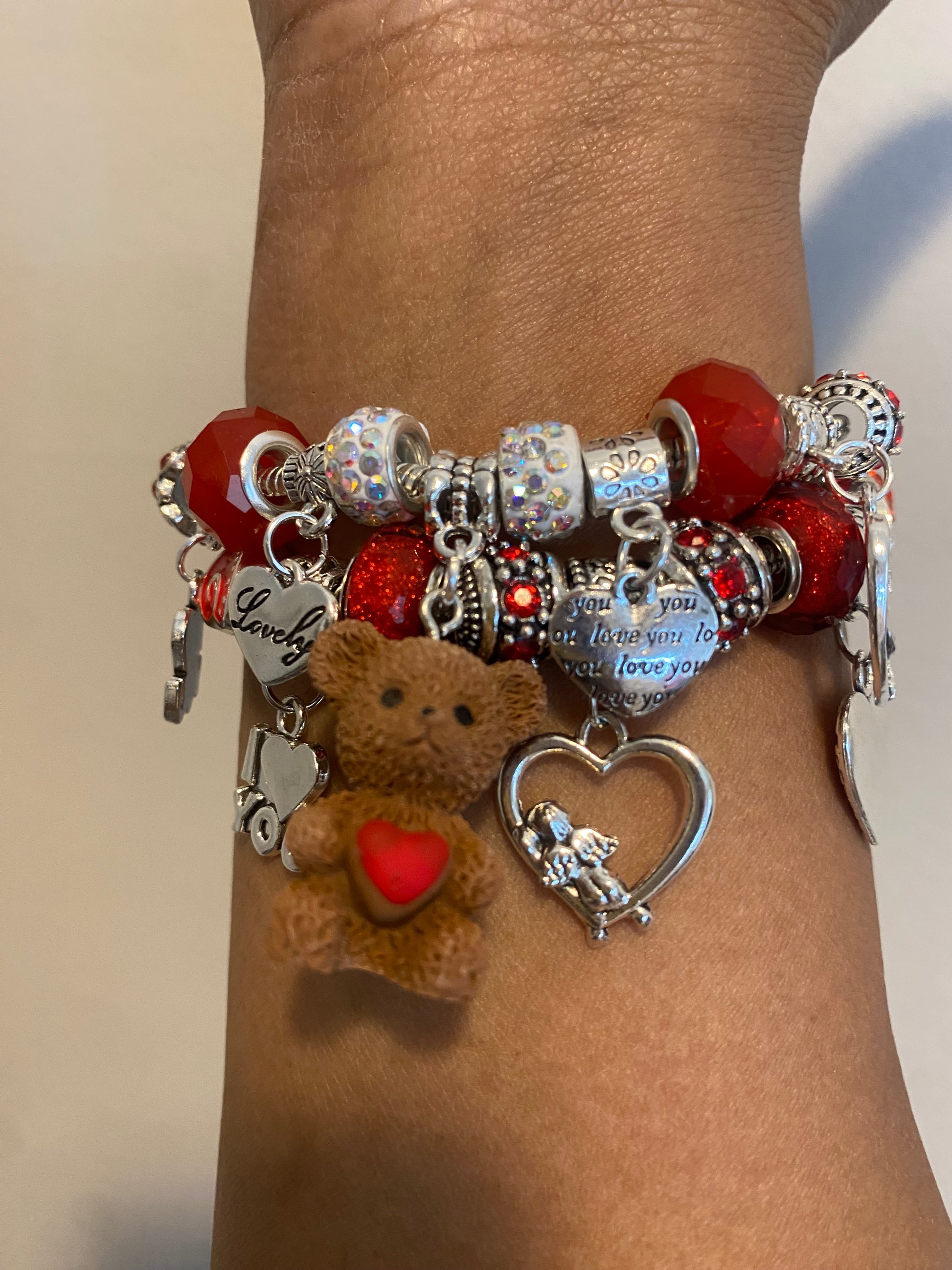 Our adorable Pandora style Cupid bracelet screams chic. Assorted love charms accompany Cupid. It is a a fan fav and always selling out. Pairs well with two or more bracelets for a fuller look.